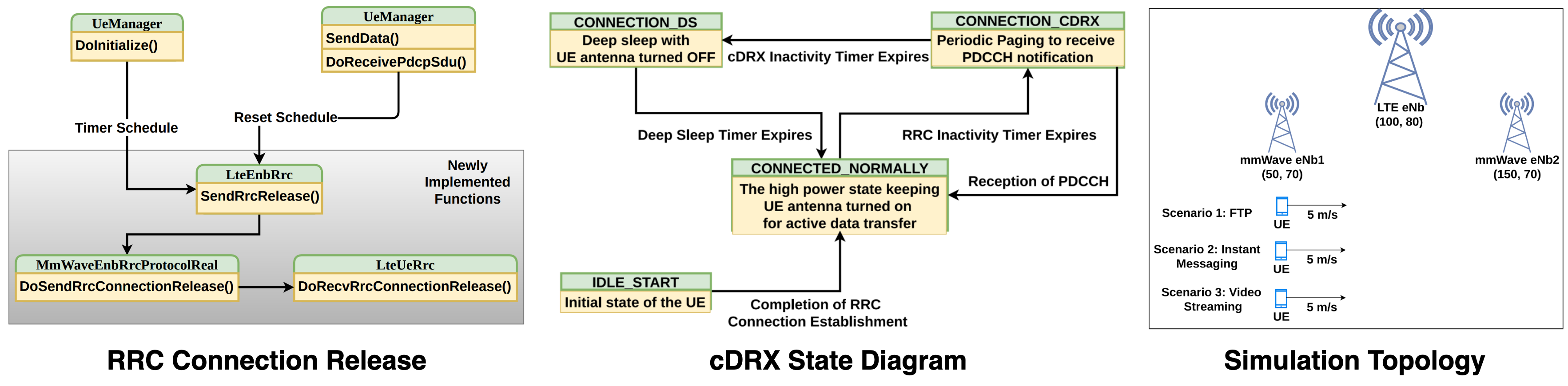 We have developed a comprehensive framework for UE RRC state-based energy modeling and power-saving schemes in the ns-3 network simulator. Our study evaluates 3GPP power-saving mechanisms, including connected-mode Discontinuous Reception (cDRX) and RRC INACTIVE state, to enhance UE energy efficiency in 5G mmWave networks. Additionally, we introduced SmartMME, an intelligent Base Station switching ON/OFF strategy, to further optimize network power consumption.