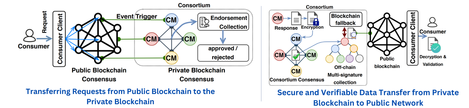 - Contribution 2: The Consensus on Consensus mechanism handles the secure and verifiable transfer of data from the open network into the private blockchain.