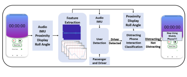 The rising ubiquity of smartphones for navigation, driver mode, etc., has increased their use significantly among drivers; however, there are growing numbers of road fatalities being reported due to distractions from the phone while driving. Notably, existing studies indicate that drivers know the harmful consequences of using a phone while driving; however, they get tempted to use it for multiple reasons, like texting a friend, exploring navigation routes, browsing music, etc. In this work, we developed a smartphone based application to identify whether the user of the smartphone is a driver or a passenger and whether the driver’s interaction with the smartphone leads to distraction or not. To the best of our knowledge, this is a first of its kind application that does not use any preconfiguration or connection with the vehicle, but passively identifies the user of the smartphone based on the noise and vibration analysis within the vehicle, and figures out the level of distraction due to the smartphone usage.